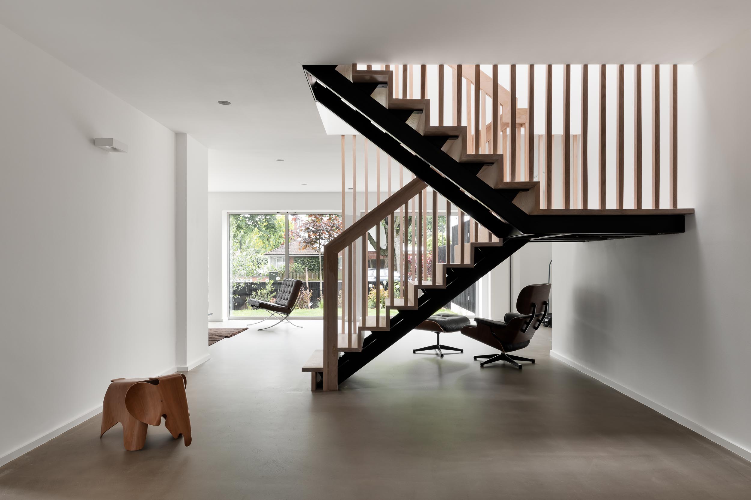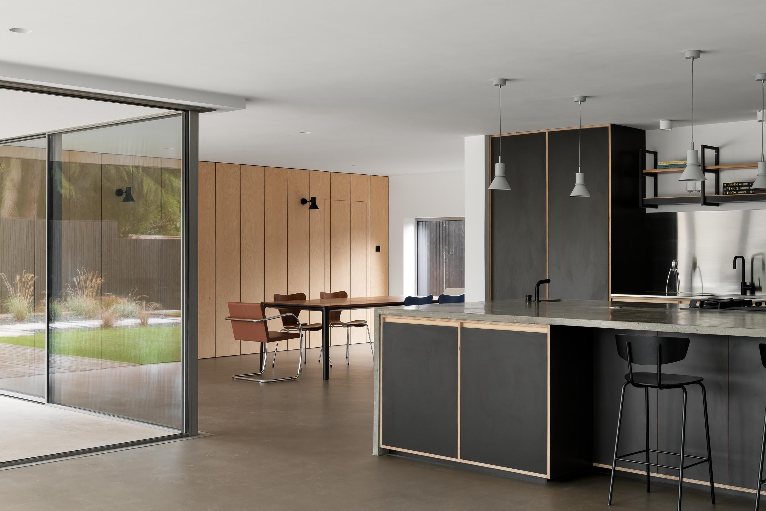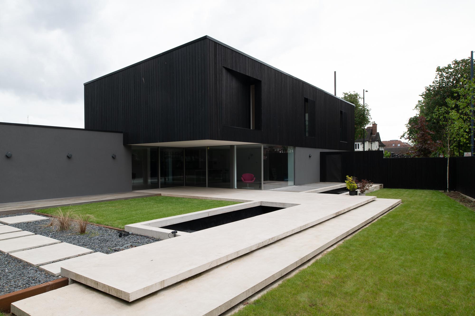 With no curves, architectural lines, natural surfaces and cast concrete terraces it fits the brief perfectly. The open plan design and floor to ceiling windows provide uninterrupted views of the generous yet minimal enclosed garden area.