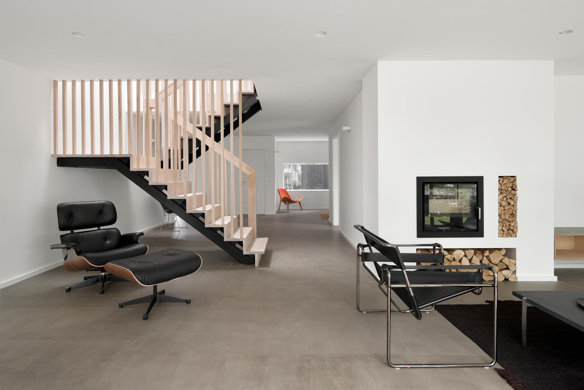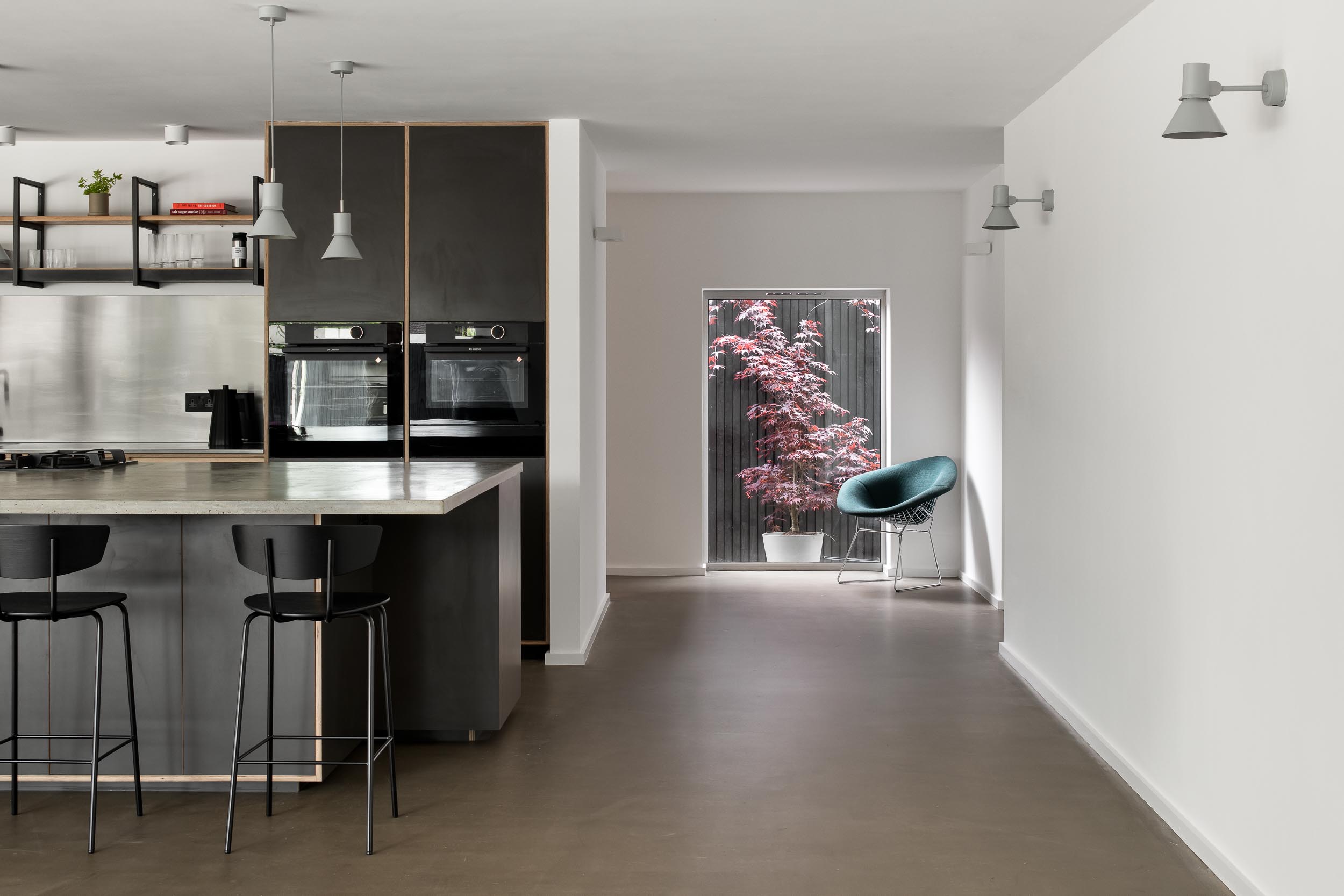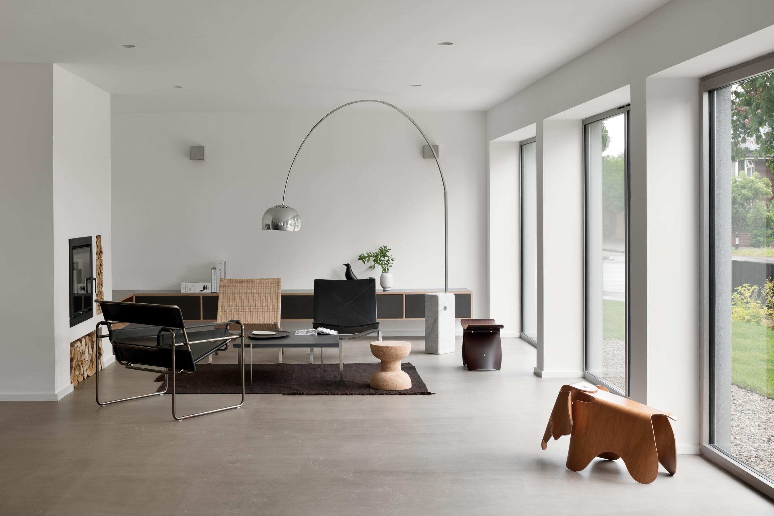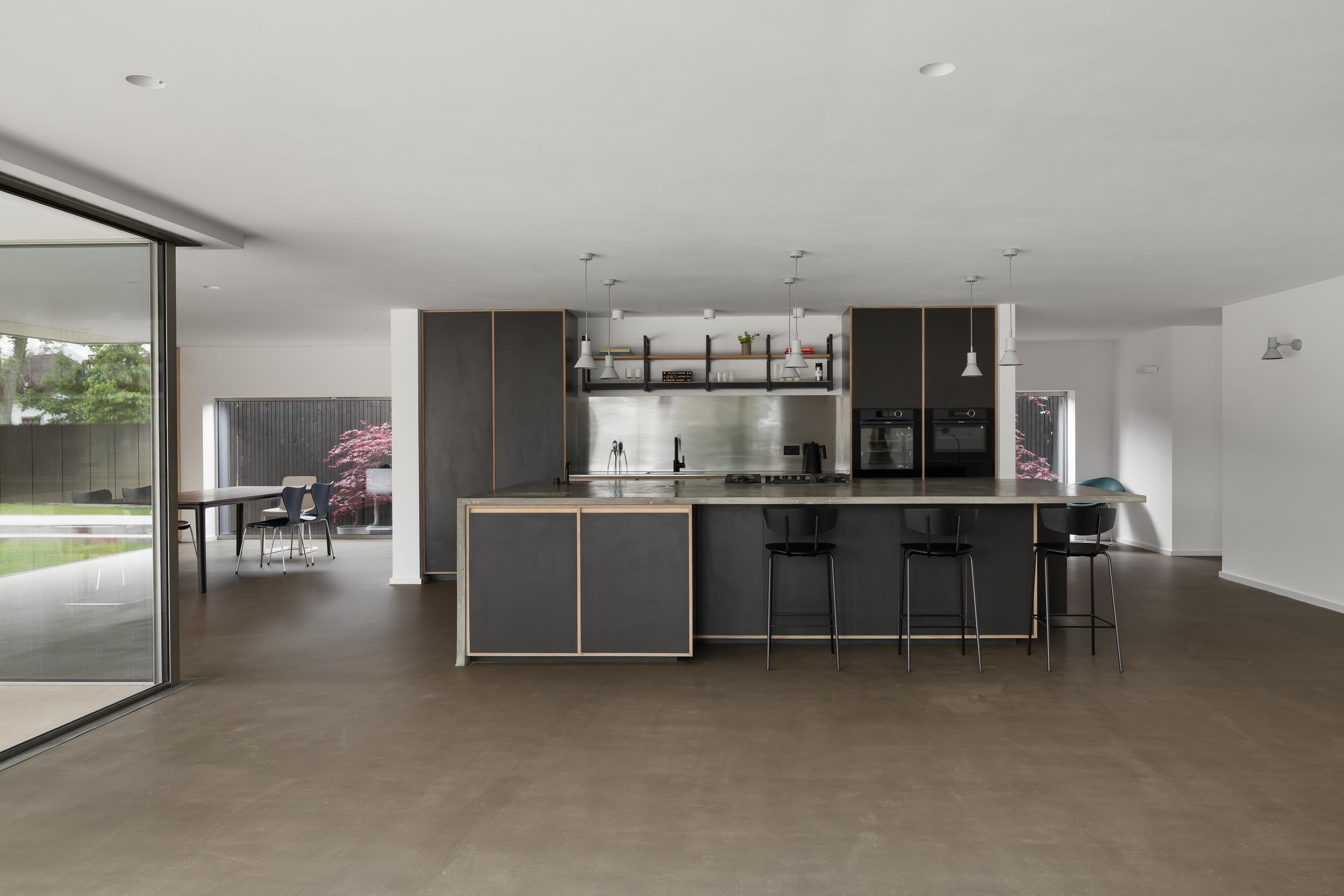 With no curves, architectural lines, natural surfaces and cast concrete terraces it fits the brief perfectly. The open plan design and floor to ceiling windows provide uninterrupted views of the generous yet minimal enclosed garden area.